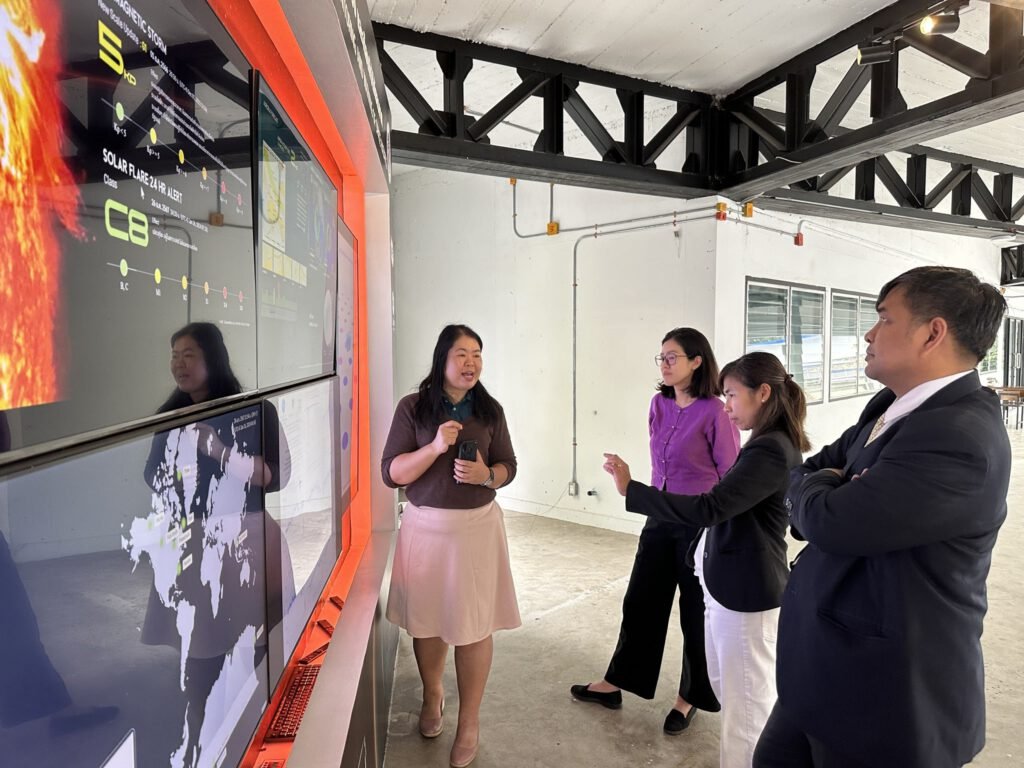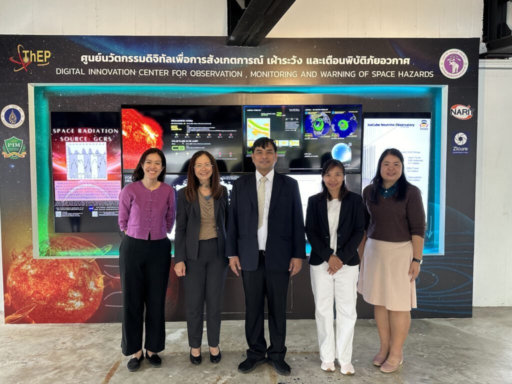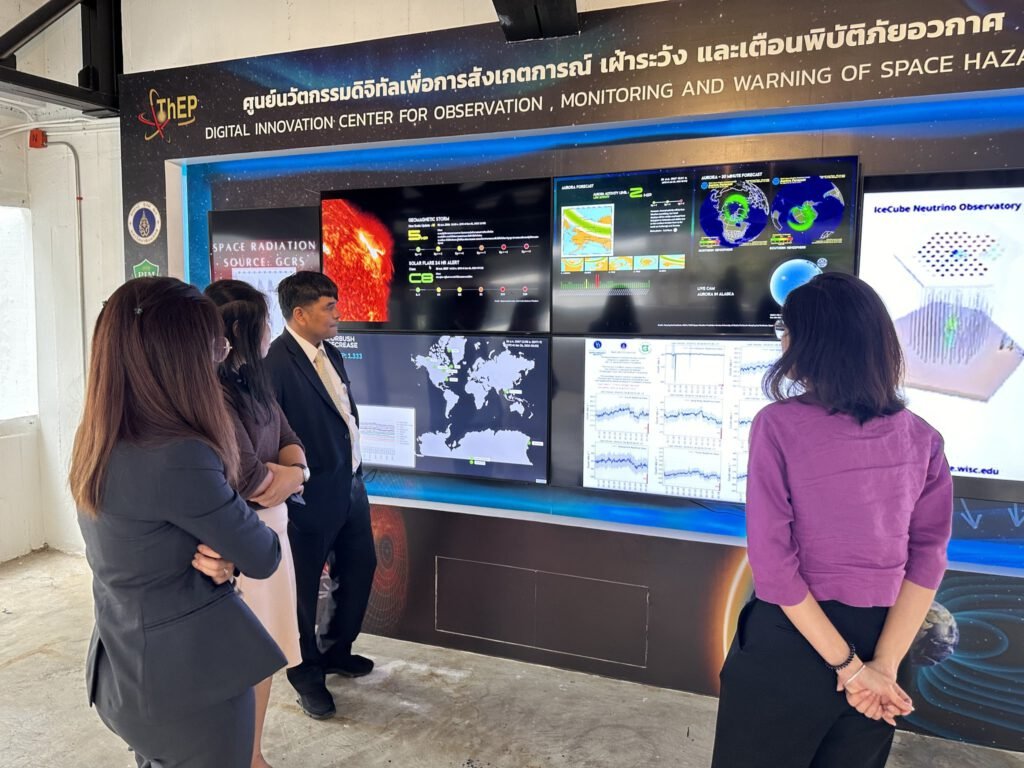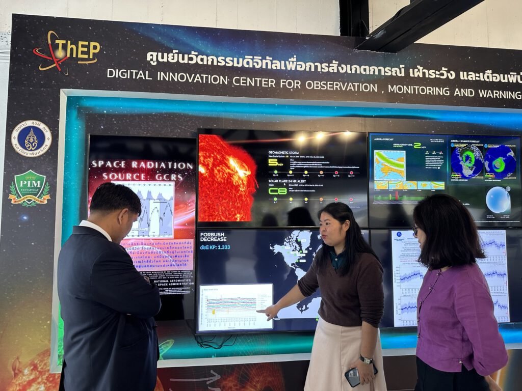 และปิดท้ายด้วยการเยี่ยมชมศูนย์นวัตกรรมดิจิทัลเพื่อการสังเกตการณ์ เฝ้าระวัง และเตือนภัยพิบัติอวกาศ (CMU Space Weather Warroom) ซึ่งเป็นศูนย์กลางในการนำเสนอและให้บริการข้อมูลด้านสภาพอวกาศ (Space Weather) โดยใช้เทคโนโลยีสารสนเทศในการบริหารจัดการข้อมูลทางอวกาศจากสถานีตรวจวัดรังสีคอสมิกและอนุภาคพลังงานสูงที่เป็นเครือข่ายทั่วโลก ที่มีทั้งบนพื้นโลก ใต้พื้นดิน และบนอวกาศ โดยมี ผู้ช่วยศาสตราจารย์ ดร.ศิรามาศ โกมลจินดา และ ผู้ช่วยศาสตราจารย์ ดร.สุวิชา วรรณวิเชียร นักวิจัยกลุ่มวิจัยระบบนิเวศโลก-อวกาศ มหาวิทยาลัยเชียงใหม่ให้การต้อนรับและบรรยายการดำเนินงานของศูนย์นวัตกรรมดิจิทัลฯ