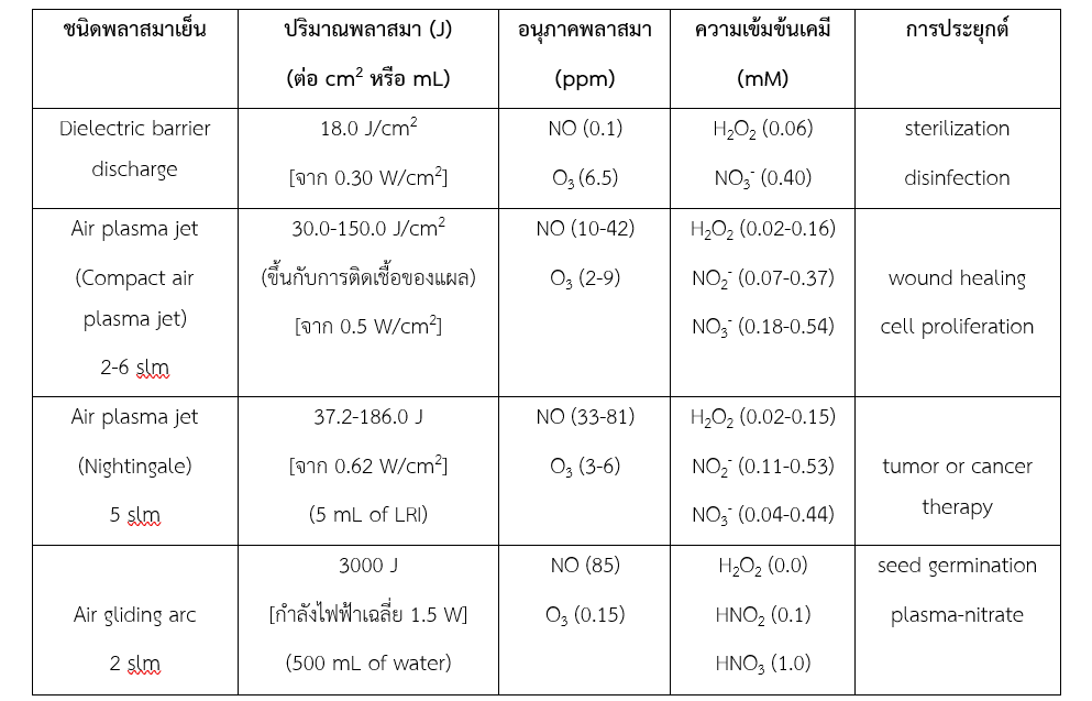 ตารางที่ 2 ปริมาณพลาสมาเย็น (dose) อนุภาคพลาสมา ความเข้มข้นเคมี และลักษณะการประยุกต์