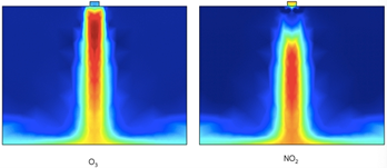 อนึ่งเราสามารถจำลองการกระจายตัวของอนุมูลในพลาสมาเจ็ทอากาศได้ดังรูปที่ 2 โดยใช้โปรแกรม COMSOL multiphysics ทั้งนี้เพื่อใช้ยืนยันผลการวัดปริมาณอนุมูล O3 กับ NO2 ที่แพร่กระจายถึงพื้นผิวเป้าหมาย ก่อนที่จะทำปฏิกริยากันเกิดเป็นอนุภาคเคมีใหม่บนพื้นผิว หรือในตัวกลาง ดังตารางที่ 2 [3-6]