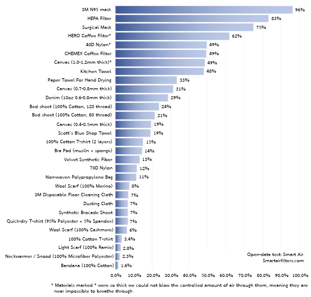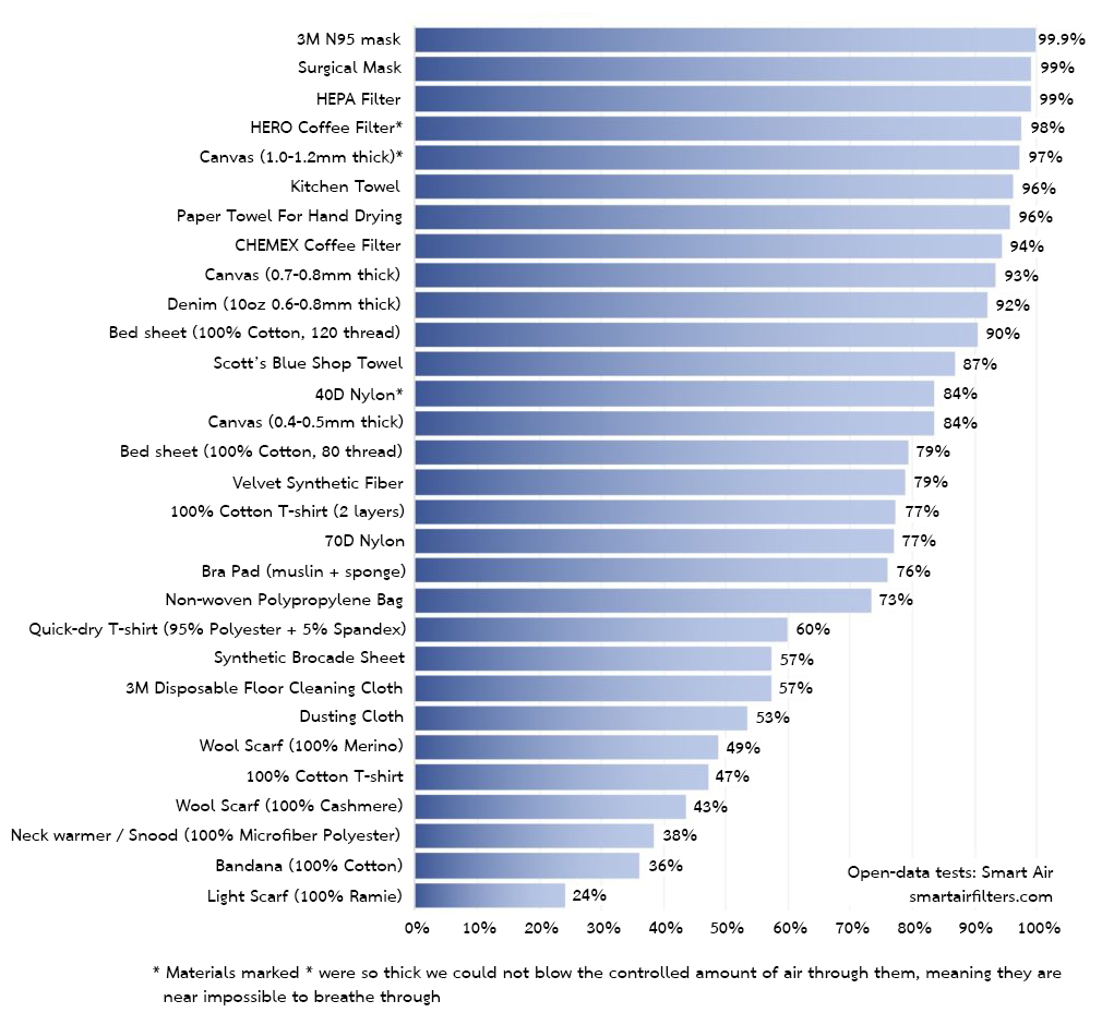 รูปที่ 4 แสดงประสิทธิภาพในการกรองสกัดละอองขนาด 0.3 ไมครอน (ขนาดประมาณเท่ากับไวรัสโรคฝีดาษหรือไข้ทรพิษ) ของวัสดุต่างๆ 27 ชนิดที่หาได้ไม่ยากในท้องตลาด เปรียบเทียบกับวัสดุกรองมาตรฐาน 3 ชนิดคือหน้ากาก N95 ของ 3M, หน้ากากอนามัยทางการแพทย์ และแผ่นกรอง HEPA (high-efficiency particulate air) ซึ่งเป็นวัสดุมาตรฐานที่ใช้กรองอากาศของห้องปลอดเชื้อ/ปลอดฝุ่น (clean room) โดยทั้งนี้การทดลองไม่ได้นำผลของการรั่วไหลเนื่องจากช่องห่างระหว่างขอบหน้ากากกับใบหน้ามาคิดรวมด้วย [1]