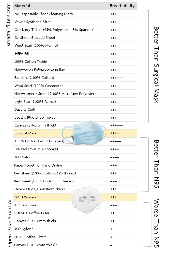 | วัสดุ | ประสิทธิภาพการกรองละออง 0.3 ไมโครเมตร | ประสิทธิภาพการกรองละออง 1 ไมโครเมตร | ความสะดวกในการหายใจ |