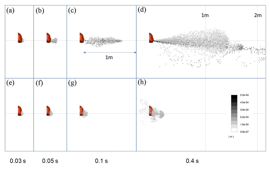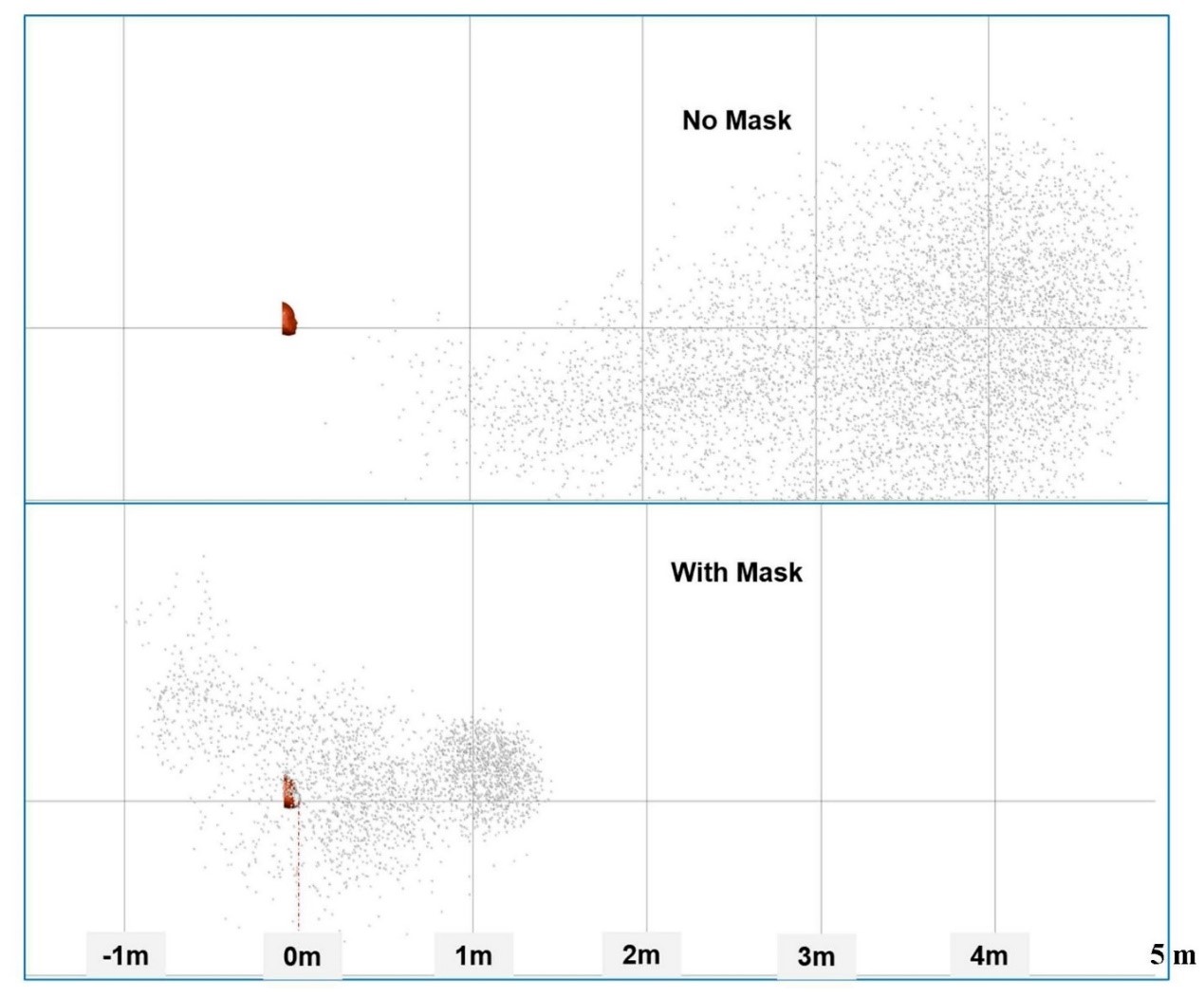 บางส่วนของผลการคำนวณสรุปไว้ในรูปที่ 3 จะเห็นได้ว่าแม้เป็นเพียงหน้ากากผ้าทำมือแต่ก็สามารถใช้ป้องกันการแพร่ระบาดของไวรัสได้ดี กล่าวคือ รูปที่ 3(ก) แถวบนแสดงให้เห็นว่าการไม่ใส่หน้ากากสามารถพ่นละอองทั้งเม็ดเล็กและเม็ดใหญ่ให้ฟุ้งกระจายออกไปทางด้านหน้าได้ไกลกว่า 1 เมตร ภายในช่วงเวลาเพียง 0.4 วินาทีหลังการจาม โดยละอองเม็ดใหญ่ที่หนักกว่าจะตกลงสู่พื้นก่อน ซึ่งทำให้เกิดการแปดเปื้อนเชื้อโรคบนพื้นและ/หรือวัตถุสิ่งของที่อยู่ในอาณาบริเวณนั้น แล้วถูกนำพาไปสู่บริเวณอื่นจากการสัมผัสหรือย่ำเหยียบ เมื่อเป็นเม็ดขนาดใหญ่ก็ย่อมบรรจุเชื้อโรคมามากกว่าเม็ดเล็ก ในขณะที่ละอองเม็ดเล็กมากยังคงอ้อยอิ่งอยู่ในอากาศได้นาน แต่ครั้นเมื่อสวมใส่หน้ากาก (แถวล่างจาก e – h) แม้เป็นผ้าฝ้ายชั้นเดียวก็สามารถดักสกัดละอองเม็ดใหญ่ไว้ได้เกือบทั้งหมด ผลที่เห็นได้ชัดก็คือช่วยป้องกันการแปดเปื้อนเชื้อโรคบนพื้นได้มาก ที่เหลือลอดออกไปได้ก็เป็นละอองที่มีขนาดเล็กกว่า 4 ไมโครเมตร แต่เนื่องจากอากาศถูกผ้าหน่วงไว้ ละอองขนาดเล็กเหล่านี้จึงฟุ้งออกไปได้ไม่ไกล และน่าสังเกตุว่ามีละอองขนาดเล็กบางส่วนเล็ดลอดผ่านช่องห่างระหว่างหน้ากากกับผิวหน้าฟุ้งออกไปด้านหลังได้ แสดงให้เห็นว่าการแนบสนิทกับใบหน้าก็มีความสำคัญที่ไม่ควรละเลย ส่วนรูปที่ 3(ข) แสดงให้เห็นว่า 60 วินาทีหลังการจาม ละอองขนาดเล็กที่ถูกพ่นออกมาฟุ้งกระจายไปได้ไกลถึง 5 เมตร แต่ถ้าสวมหน้ากากจะไปได้ไกลเพียง 1.25 เมตรเท่านั้น สอดคล้องกับคำแนะนำให้เว้นระยะห่าง social distancing 1.5 เมตร